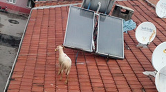 Bursa’da sahibinin elinden kaçan kurbanlık koyun, 3 katlı apartmanın çatısına çıktı.