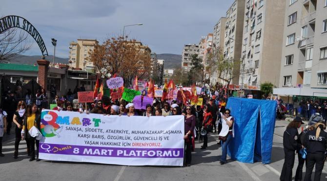 8 Mart Kadınlar Platformu'nun çağrısı üzerine bugün öğlende, Bornova Stadı önünde yaklaşık bin 100 kadın toplandı. Polis kontrol noktasından geçen kadınlar, sık sık 'Kadınlar özgür olsa dünya yerinden oynar', 'Susma haykır eşcinseller vardır', 'Diyanet elini bedenimden çek' sloganları attı. Mustafa Kemal Caddesi'nden Cumhuriyet Meydanı'na doğru yürüyüşe başlayan gruptakilerden bazıları, 'Kürdistan faşizme mezar olacak', 'Kürdistan'da düşene dövüşene bin selam' sloganı attı. Bu sırada caddedeki apartmanlarda oturanlar, pencere ve balkonlarından Türk bayrakları salladı, gruba tepki gösterdi. Meydana gelen grup, burada da polis arama noktasından geçti. Alana basın mensubu ve polisler dışında erkek alınmazken, kadınlar ve eşcinseller, yapılan aramaların ardından alındı. Grubun kendi görevlileri de alana girenlerin üstlerini aradı. Grupla polis arasında, arama noktasında kısa süreli gerginlik de yaşandı.