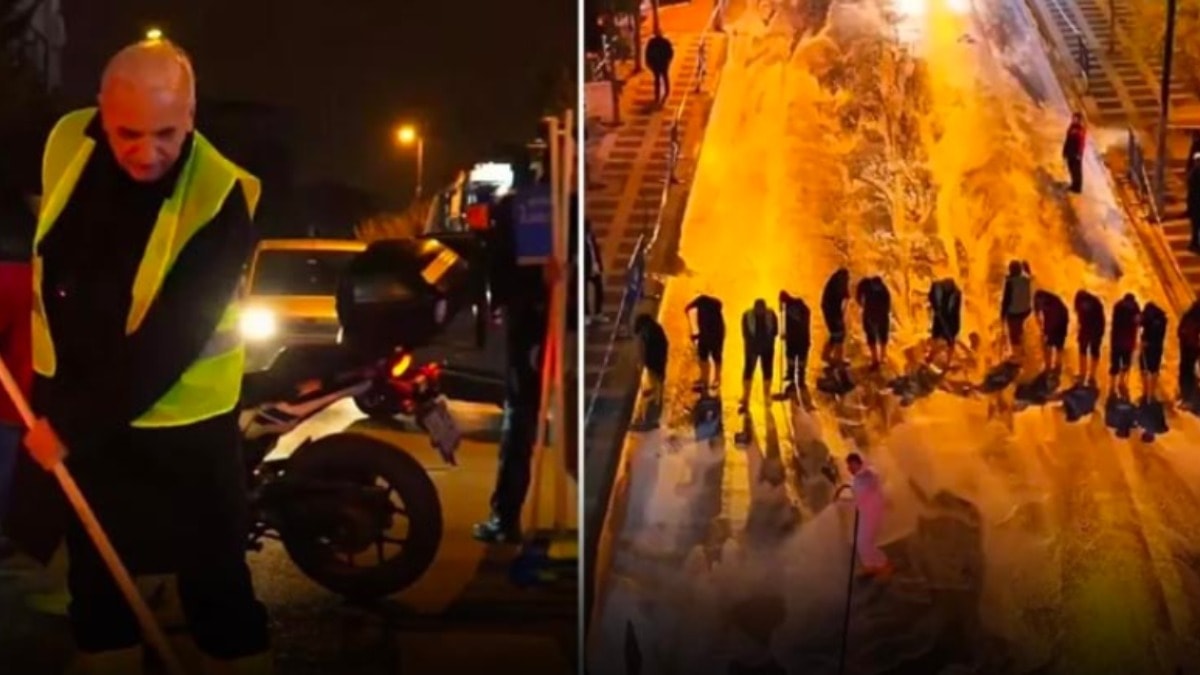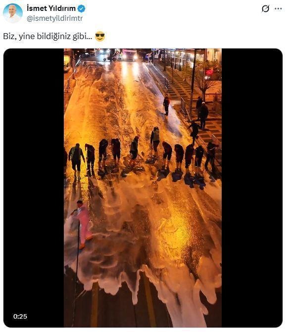 Belediyenin resmi hesaplarından paylaşıldığı öne sürülen görüntülerde, temizlik ekiplerinin araçlarla cadde ve kaldırımları tazyikli suyla yıkadığı görüldü. Videonun arka planında Kurtlar Vadisi dizisinin karakteri Polat Alemdar’ın sesinin kullanılması da dikkat çekti.