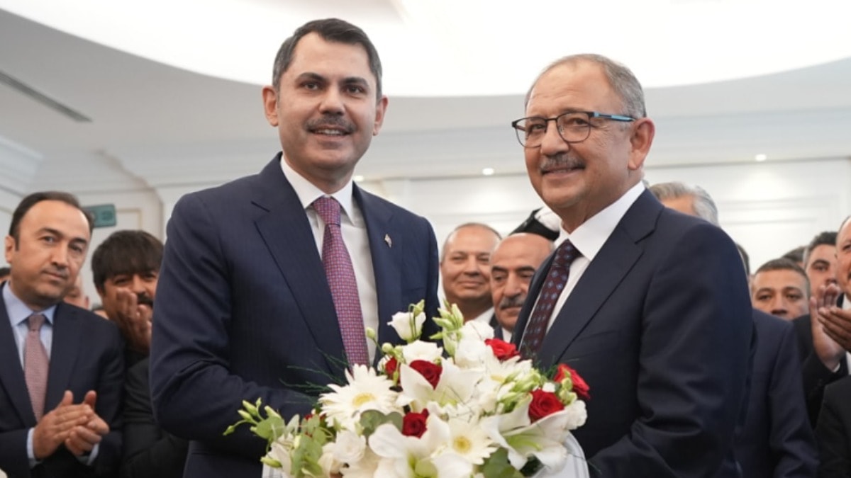Kurum (solda), bakanlıkta düzenlenen törenle görevi Özhaseki’den devraldı. Özhaseki, “30 yıl önce kamu hizmetine başlamıştım, çok şükür bu günlere kadar geldik” dedi. Kurum ise “Başta İstanbul olmak üzere 81 ilimizde deprem dönüşümü noktasında yapılması gereken her türlü gayreti, hiçbir siyaset gözetmeksizin vatandaşlarımıza karşı sözlerimizi tutmaya gayret edeceğiz” dedi.
