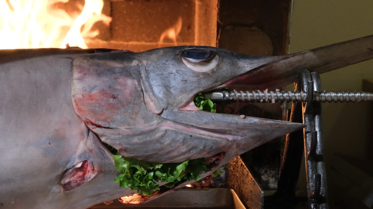 Yemeğin yapım aşamasında ilk olarak kılıç balığını temizleyen şefler, solungaçlarını ve kuyruğunu keserek cağ kebabı ocağına balığı yerleştirerek geleneksel cağ kebabı gibi keserek servis etti.
