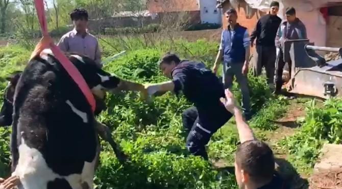 ADAPAZARI'nda tarlada otlarken 2.5 metre derinliğindeki kuyuya düşen inek, itfaiye ekiplerinin iş makinesine bağladığı iple kurtarıldı.