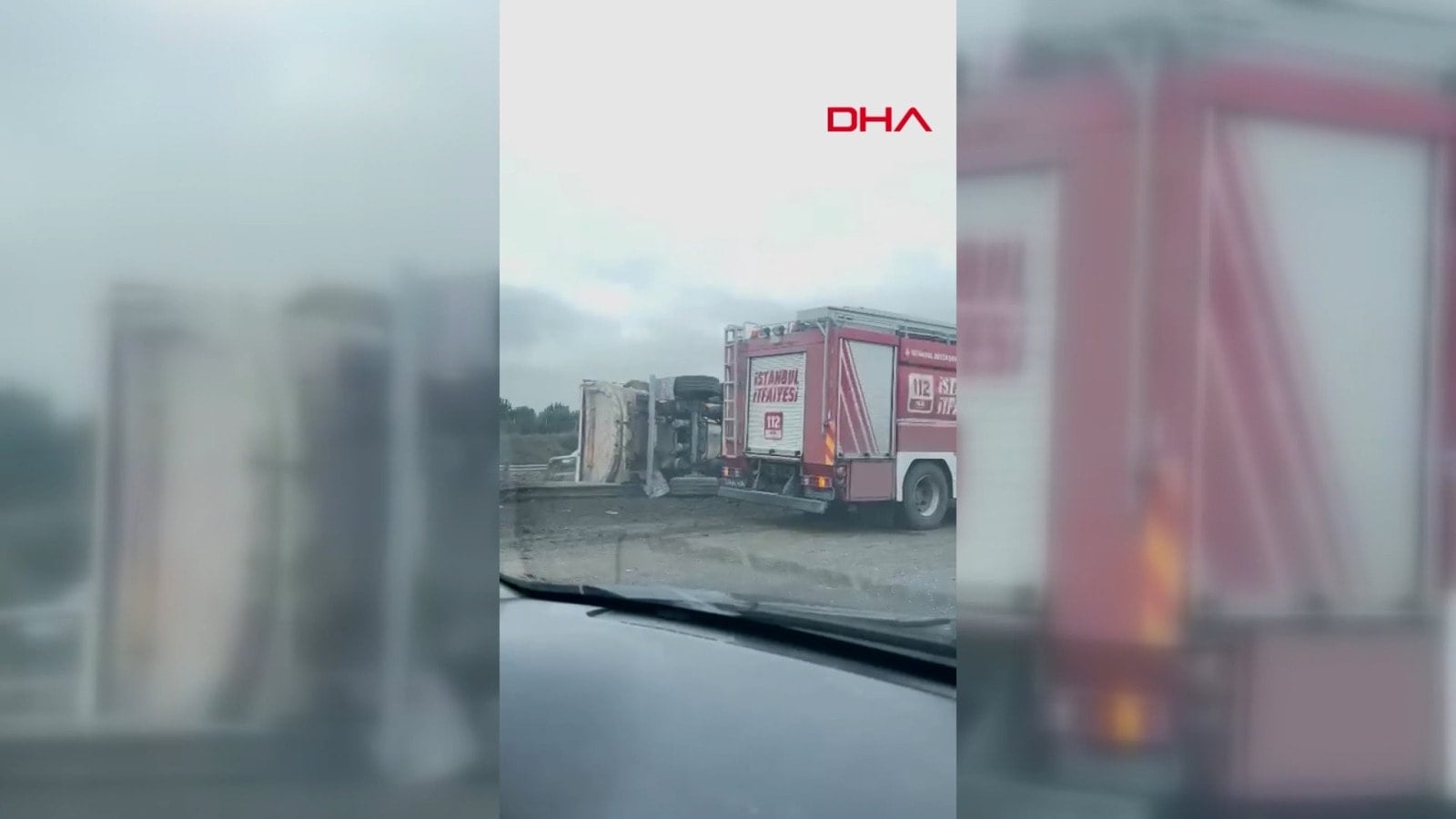 Kuzey Marmara Otoyolu Göktürk geçişinde sürücüsünün direksiyon hakimiyetini kaybettiği hafriyat kamyonu devrildi. Devrilen kamyonun kasasındaki yükün yola saçılmasıyla birlikte trafik akışı durma noktasına geldi.