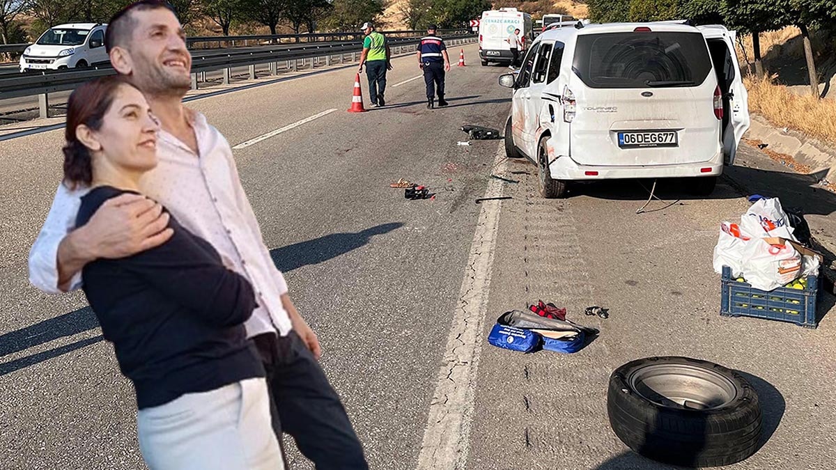 Seydoş Kaya, patlayan lastiği nedeniyle 06 DEG 677 plakalı hafif ticari aracı yol kenarına çekti. Eşi Eylem Kaya da lastik değişimi sırasında kendisine yardım etti.