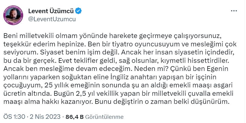 Tiyatrocu Levent Üzümcü sosyal medya hesabından yaptığı paylaşımda "Beni milletvekili olmam yönünde harekete geçirmeye çalışıyorsunuz, teşekkür ederim hepinize. Evet teklifler geldi, sağ olsunlar kıymetli hissettirdiler. Ancak ben mesleğime devam edeceğim" dedi. Üzümcü bu kararının nedenini de açıkladı.