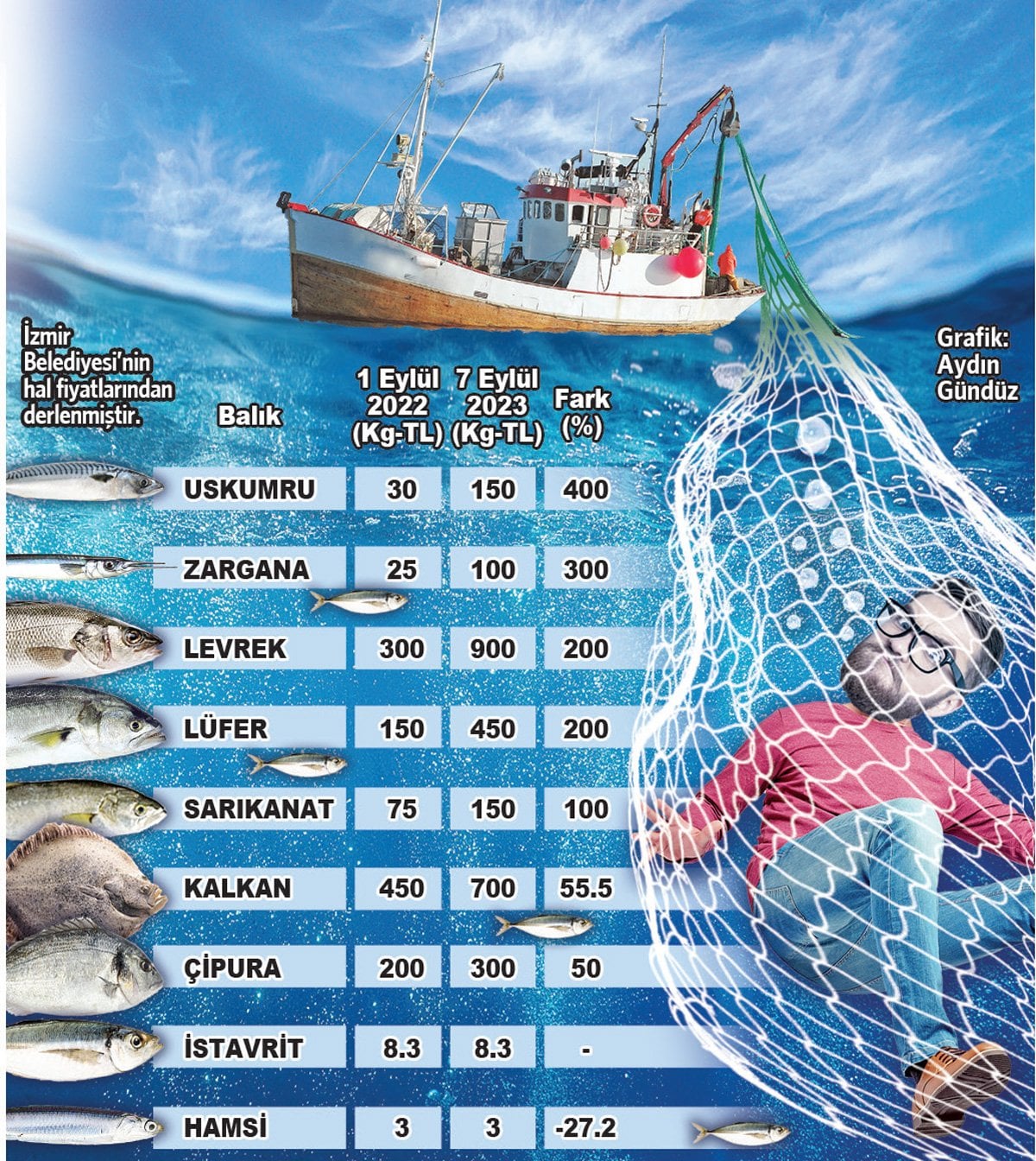 Balık hallerinde istavritin fiyatı aynı kalırken, geçen yıl 75 lira olan sarıkanatın kilogram fiyatı ise yüzde 100 artışla 150 liraya çıktı. İzmir Büyükşehir Belediyesi’nin 7 Eylül tarihli hal fiyatlarına göre çipuranın kilogram fiyatı da 2022’ye göre yüzde 50 artarak 200 liradan 300 liraya ulaştı. Levrek, yüzde 200’lük artışla 300 liradan 900 liraya ulaşırken, lüfer de aynı artış oranıyla 150 liradan 450 liraya dayandı. Zargana balığının kilogram fiyatındaki artış ise yüzde 300’ü buldu. Geçen yıl 25 lira olan zargananın kilogram fiyatı 100 liraya çıktı. Uskumrunun kilogram fiyatı ise yüzde 400’lük artışla 30 liradan 150 liraya ulaştı. Kalkan balığının fiyatı ise yüzde 55.55 artışla 450 liradan 700 liraya yükseldi. Fiyatlar tezgaha çıkınca ise daha da katlanıyor.