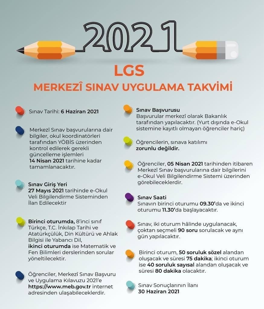 LGS kapsamında 6 Haziran 2021’de uygulanacak merkezi sınavın başvuruları, 5-14 Nisan 2021 tarihleri arasında Bakanlık tarafından merkezi olarak gerçekleştirilecek. Otomatik başvuru işlemi, yurt içinde eğitim alan tüm 8'inci sınıf öğrencileri için gerçekleştirilecek. Yurt dışında e-Okul sistemine kayıtlı olmayan okullarda öğrenim gören öğrenciler ise başvurularını yayımlanan kılavuzunda bulunan formu doldurarak yapacak. Böylece öğrencilerin ve velilerin sınav başvurusu için fiziki bir başvuru yapmasına gerek kalmayacak.