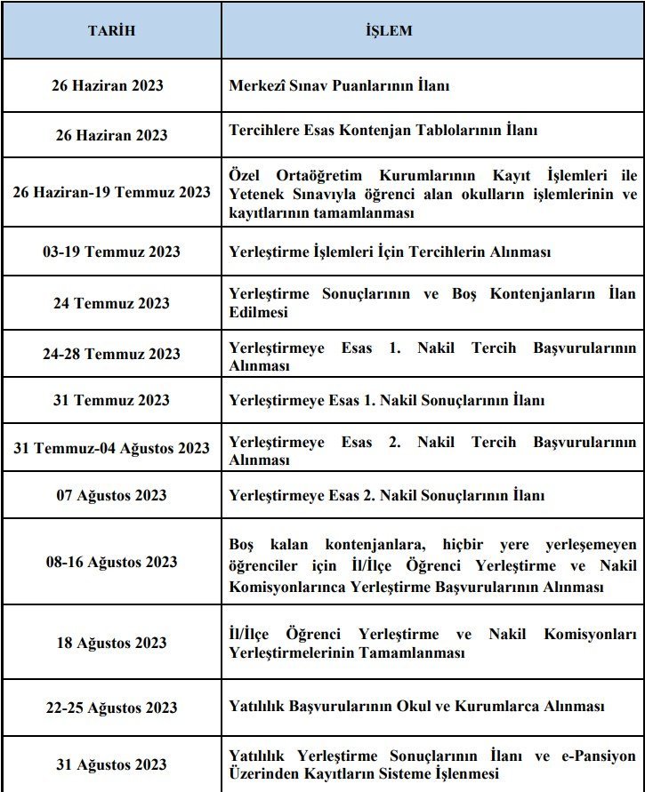 Ortaöğretim Kurumlarına Tercih ve Yerleştirme Takvimi’ne göre özel ortaöğretim kurumlarının kayıt işlemleri ile yetenek sınavıyla öğrenci alan okulların işlemleri ve kayıtları 26 Haziran-19 Temmuz tarihleri arasında gerçekleşecek.