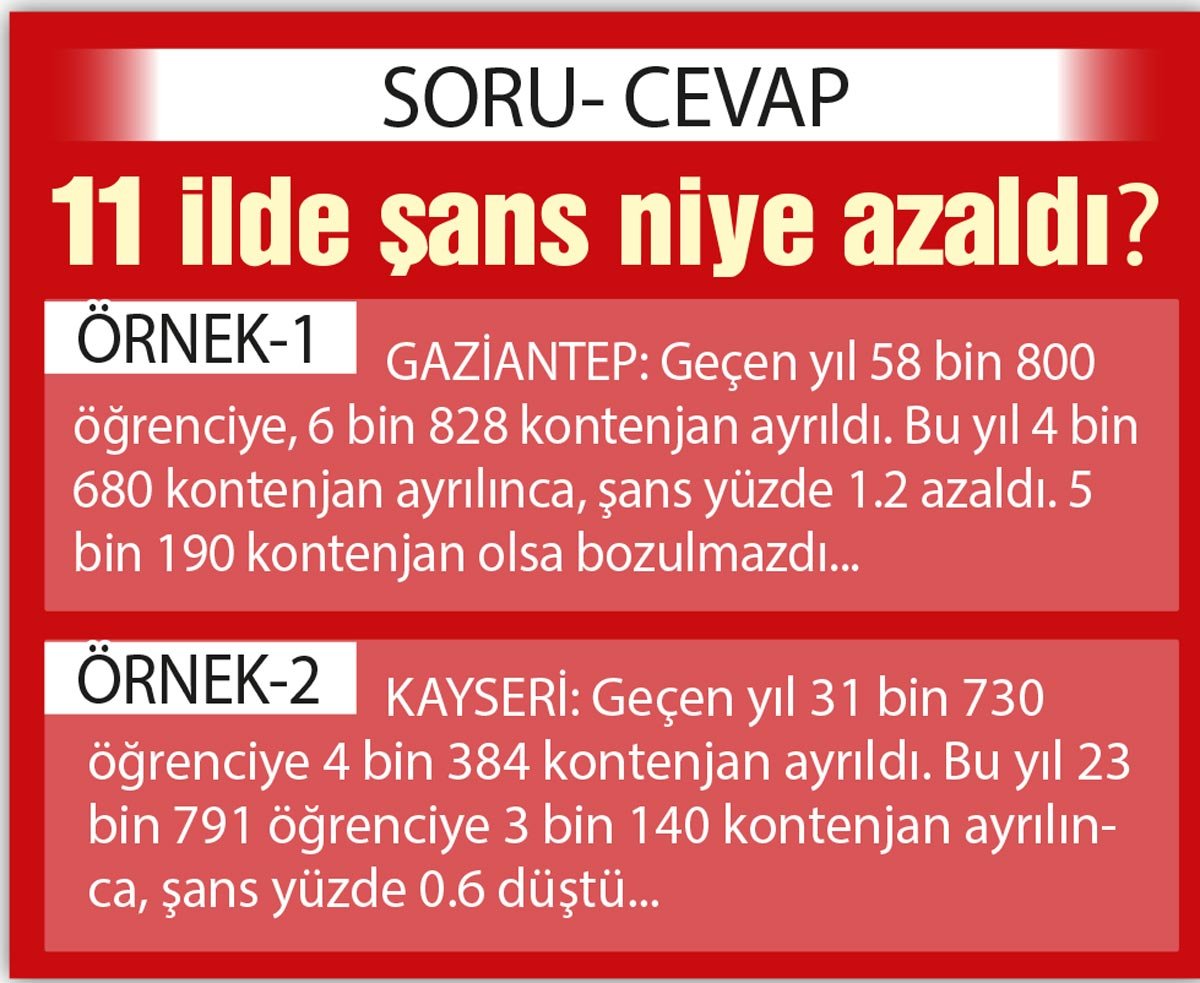 “2020’de sınava giren her 100 öğrenciden 12.2’si bir okula yerleştirilirken, 2021’de her 100 öğrenciden 13.6’sı bir okula girecek. 81 ilden 70’inde şans arttı. Aksaray, Bartın, Karaman, Kayseri, Kırıkkale, Aydın, Ankara, Sinop, Manisa, Gaziantep ve Kırşehir’in içinde yer aldığı 11 ilde bu yıl şans azaldı. Çünkü, geçen yıl yüzde 13.5 olan kontenjanlar bu illerde ortalama 0.5 düştü.”