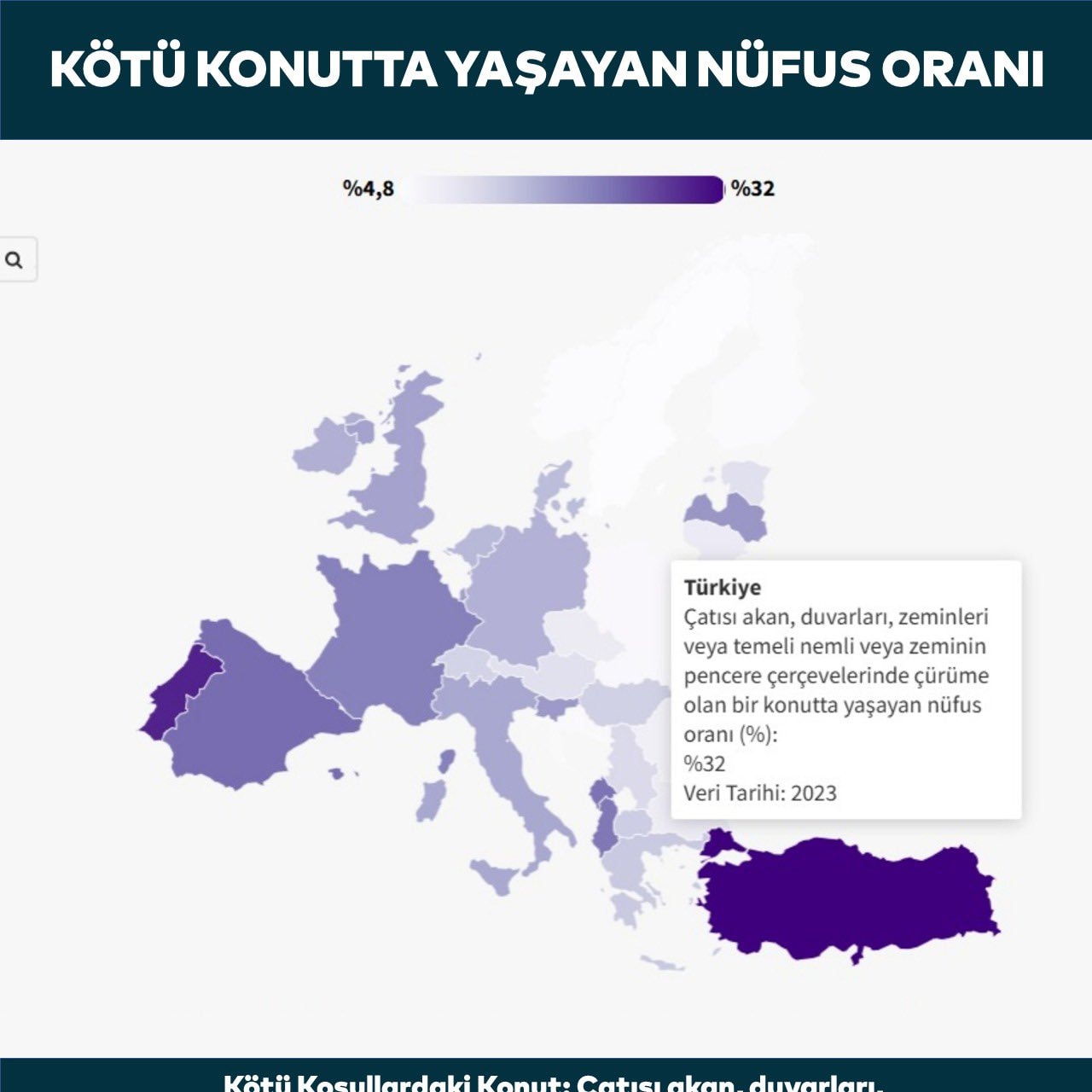 Gökce, sosyal medya üzerinden yaptığı paylaşımda, Türkiye'de konut kalitesinin her geçen yıl daha da kötüleştiğine dikkat çekti. TÜİK ve EuroStat verilerine göre, nüfusun yüzde 31,3’ü kötü koşullarda yaşamaya mahkûm olmuş durumda. Çatısı sızan, duvarları nem tutan, pencereleri çürüyen konutlar, milyonlarca vatandaşı her geçen gün daha kötü şartlarda yaşamaya zorluyor. Ayrıca, Türkiye’deki yurttaşların yüzde 30,2’si, yetersiz izolasyon nedeniyle ısınma sorunu yaşıyor. Ancak bu durum, dar gelirli vatandaşlar için çok daha zor. Dar gelirli yurttaşların yüzde 48,1’i kötü konutlarda yaşamaya mahkum.