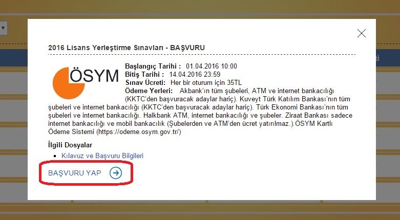 Bilgi Güncelleme: ÖSYM başarısız kayıt işleminden sorumlu değildir. Adaylar, başvuru işlemlerini yaptıktan sonra sınava ilişkin bilgilerini (sınav merkezi tercihi vb.), başvuru süresi içinde (1-14 Nisan 2016 tarihleri arasında) ÖSYM’nin https://ais.osym.gov.tr İnternet adresinden T.C. Kimlik Numaraları ve şifreleri ile değiştirebileceklerdir. Başvuru süresi tamamlandıktan sonra bu bilgilerde değişiklik yapılamaz. Merkezimize gönderilen değişiklik/düzeltme taleplerini içerir dilekçeler işleme alınmaz ve cevaplandırılmaz."