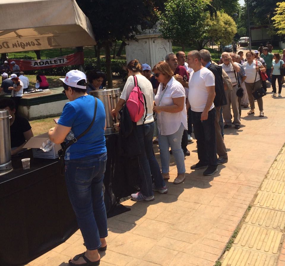 FOTO:SÖZCÜ - 'Hiçbir partiye üye değiliz' diyen iki genç. kurulan stanttan parka gelenlere ücretsiz çay ikramı yapıyor.Burada bir konuşma yapan İstanbul Barosu Başkanı Mehmet Durakoğlu "Bu ülkenin yargısı felç olmuş ayağa kaldırmamız gerek. Ülkenin muhalefeti susturulmaya çalışılıyor" dedi. Durakoğlu şöyle konuştu: "Biz avukatlar ömrümüz boyunca adalet aradık. Yargı bağımsız tarafsız olsun istedik. Bizim için yargı bağımsızlığı onurla yaşamak demektir. Yargı bağımsızlığı; hukuk, güvenlik demektir. Alnı ak başı dik insanın rahatça dolaşabilmesidir. Sabah saat altıda kapı çalındığında gelenin sütçü olması demektir. Yargı bağımsızlığı dik durabilmektir. Biz hep 'toplum adalet istesin' dedik. Adalet talep etsin dedik. Hani adalet ekmek kadar su kadar gerekli demişti ya... Adalet ekmek kadar su kadar gereklidir gerçekten de. Bizim yurttaşlarımız ekmek istedi aş istedi iş istedi ama adalet talep etmediler. Edin ne olur? Ne olur adalet talep edin ne olur? Adalet olmazsa onurumuzla ayakta kalamayız. Yaşamak için bu toplumun ayakta kalabilmesi için yalnızca hukuk olması bile yeter neredeyse. Hukuk olmadan olmaz. Ana muhalefet partisi lideri de bu gerçekliğe ışık tutan bir eylemsellik içinde. Sessiz kalamazdı. Bu bizim işimiz. Biz yıllardır söylediğimiz şey. Kim nerede eylem yapıyorsa yanında olmalıyız çünkü biz de adalet arıyoruz"