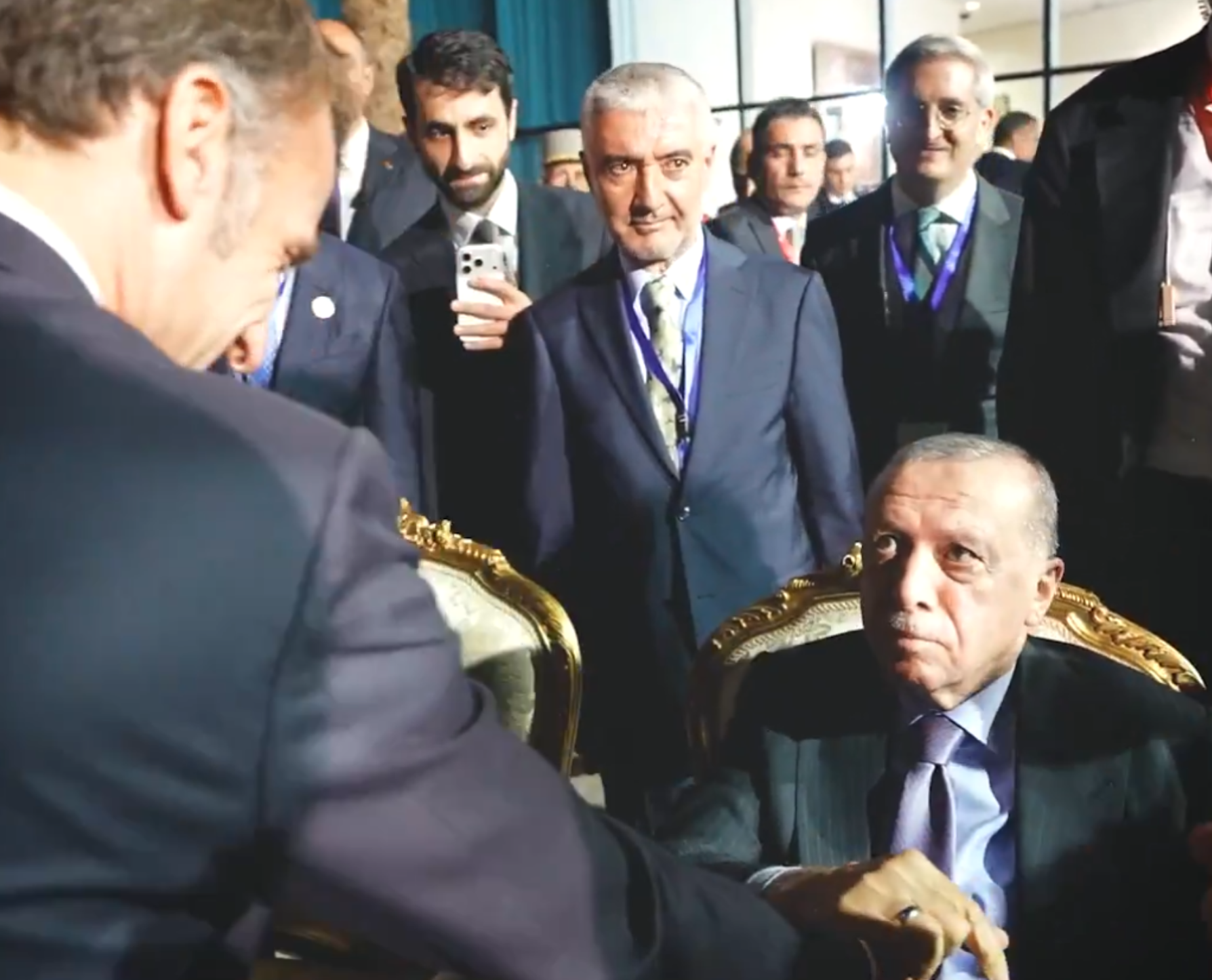 Macron'un "barış için hep birlikte" yazıyla paylaştığı video, Şarm El Şeyh'teki barış zirvesinde Erdoğan'la el ele olan Macron'la açılıyor.