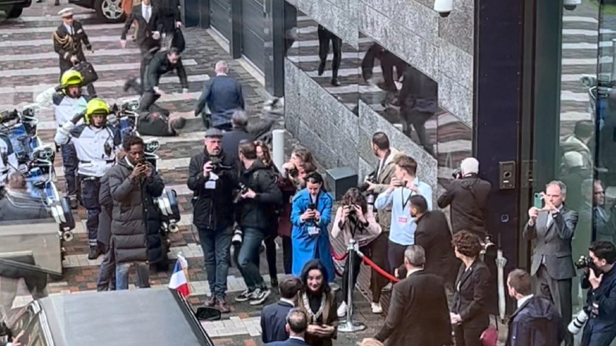 Olaya ilişkin sosyal medyaya yansıyan görüntülerde, protestocunun yere yatırılmadan önce uzaktan Macron'a doğru koşarak gelmesi ve üç kişinin slogan atan kişiye müdahale ederek yere yatırması görülüyor.