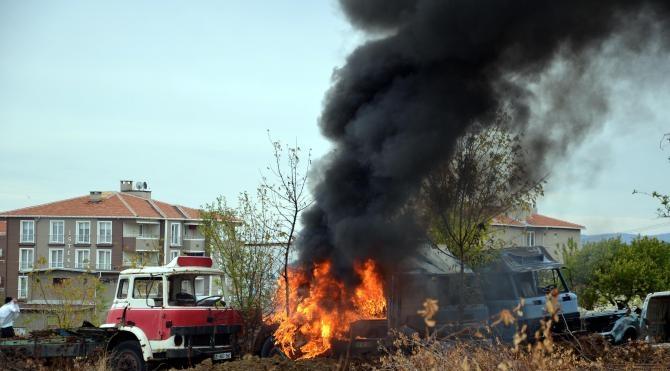 Murat YAYIN/MALKARA(Tekirdağ), (DHA) TEKİRDAĞ'ın Malkara İlçesi'nde çeşitli suçlarda kullanılan ve yediemine teslim edilerek parka çekilen araçlar, madde bağımlısı olduğu belirtilen kişiler tarafından ateşe verilip yakıldı. Parktaki 15 araçtan 3'ü tamamen kül olurken, itfaiye alevleri diğer araçlara sıçramadan kontrol altına aldı.