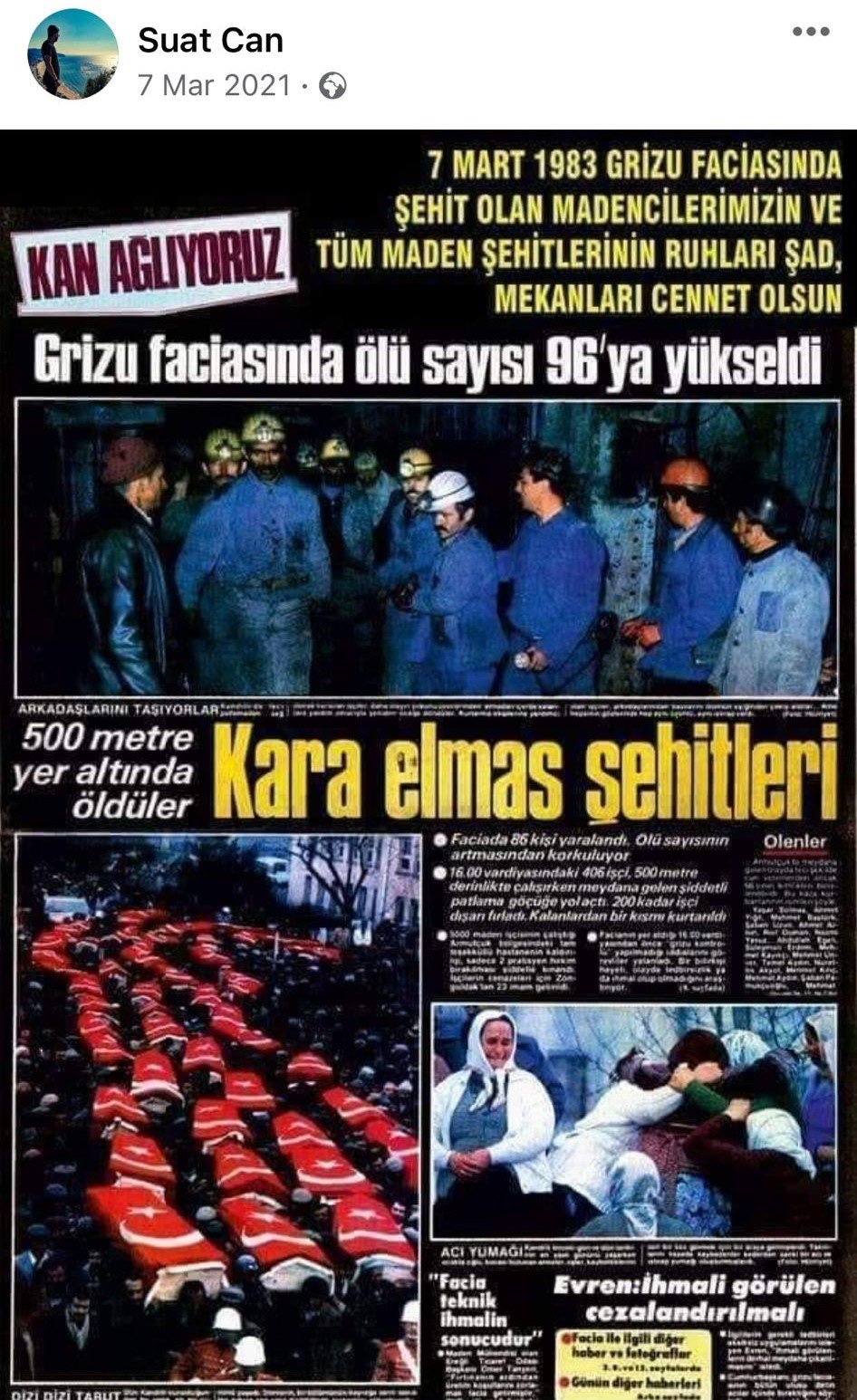 Serhat KahramanMaden faciasında hayatını kaybeden Suat Demirkıran'ın ise geçen yıl, 7 Mart 1983 yılında Zonguldak'ın Armutçuk beldesindeki taş kömürü ocağında meydana gelen grizu patlamasında hayatını kaybedenleri manşetine taşıdığı gazetenin sayfasını hesabından paylaştığı görüldü.