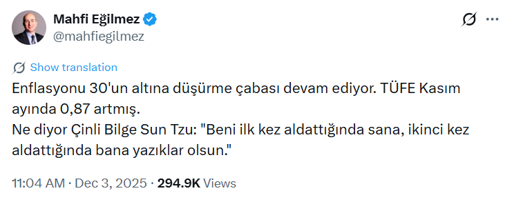 Ekonomist Mahfi Eğilmez, enflasyon rakamlarına ilişkin değerlendirmesinde klasik ekonomi yorumlarının ötesine geçerek Sun Tzu’nun Savaş Sanatı eserinden bir pasajı hatırlattı. “Enflasyonu 30'un altına düşürme çabası devam ediyor. TÜFE Kasım ayında 0,87 artmış” diyen Eğilmez, ardından Çinli düşünürün sözünü aktararak, “Ne diyor Çinli Bilge Sun Tzu: ‘Beni ilk kez aldattığında sana, ikinci kez aldattığında bana yazıklar olsun’” ifadelerini kullandı.