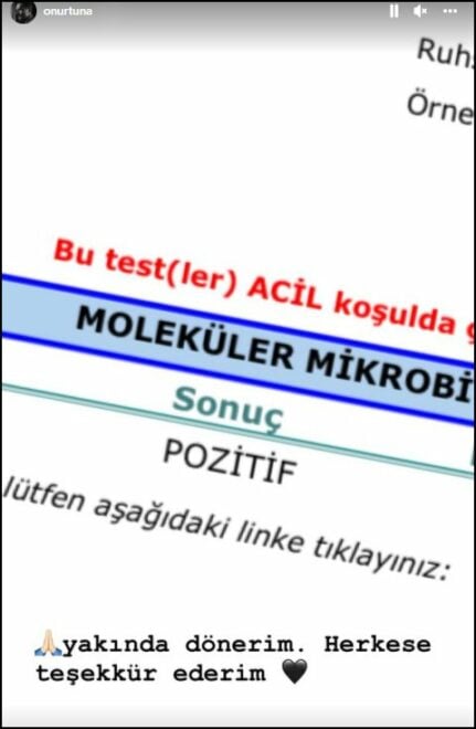 Günlerdir testleri negatif çıkan Onur Tuna'nın son testi ise pozitif çıktı. Coronaya yakalandığını Instagram hesabından duyuran Tuna, paylaşımında "Yakında dönerim, herkese teşekkür ederim" dedi.