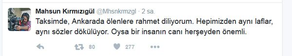 Ankara'ya sessiz kalması nedeniyle takipçileri tarafından eleştirilen Kırmızıgül, Taksim saldırısıyla birlikte Twitter adresinden açıklama bulundu. Kırmızıgül, "Taksimde, Ankarada ölenlere rahmet diliyorum. Hepimizden aynı laflar, aynı sözler dökülüyor. Oysa bir insanın canı herşeyden önemli" dedi.