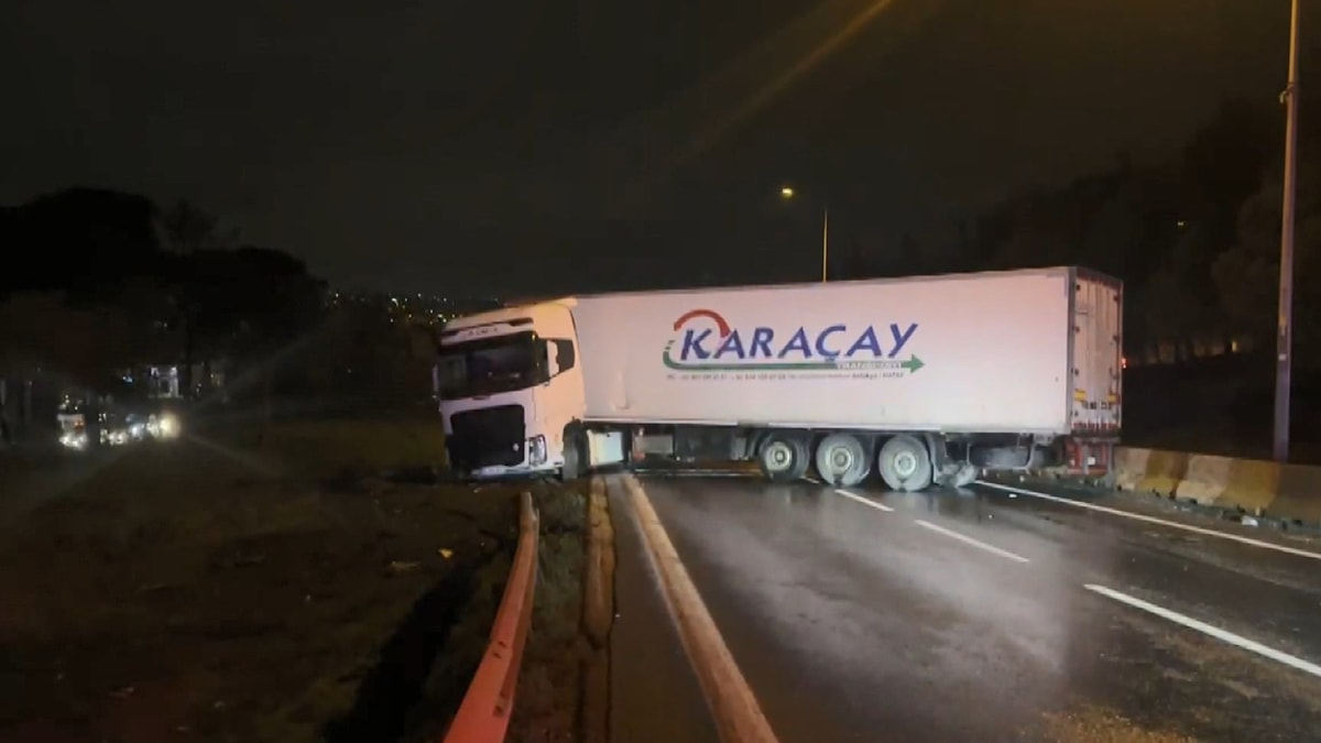 Büyükçekmece'de yokuş aşağı ilerleyen TIR'ın makaslama yapması sonucu D-100 kara yolu bir süre trafiğe kapandı.