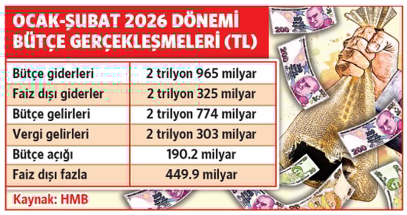 Merkezi Yönetim Bütçesi’nin 2026 yılı ilk iki aylık gerçekleşme sonuçları 16 Mart 2026 tarihinde kamuoyu ile paylaşıldı. İki aylık dönemde, 2 trilyon 965 milyar liralık gidere karşılık 2 trilyon 775 milyar lira gelir elde edildi. Bütçedeki iki aylık açık 190.2 milyar lira olarak gerçekleşti. Şubat ayında 24.4 milyar lira bütçe fazlası verilmesinin etkisiyle iki aylık kümülatif bütçe açığı 190.2 milyar lira olarak gerçekleşti.