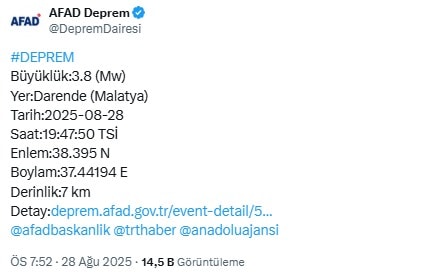Büyüklük:3.8 (Mw) Yer:Darende (Malatya) Tarih:2025-08-28 Saat:19:47:50 TSİ Enlem:38.395 N Boylam:37.44194 E Derinlik:7 km