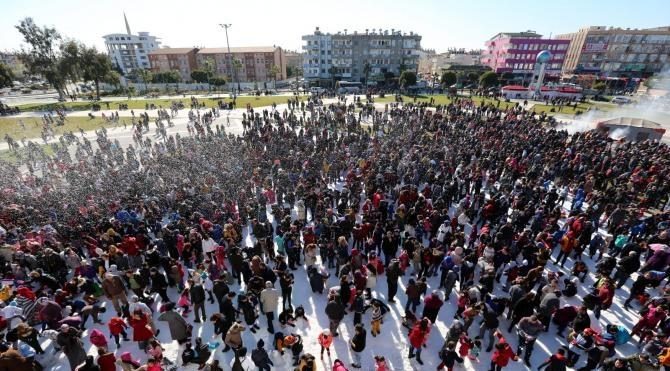 Manavgat Belediyesi tarafından Toros Dağları'nın yüksek kesimlerinden getirtilen 25 kamyon dolusu kar, Atatürk Kültür Merkezi önündeki alana dökülerek karne şenliği yapıldı. Aileleriyle etkinliğe katılan öğrenciler kartopu oynadı, kardan adam yaptı. Etkinlikte yapay kar püskürtme makinesiyle de katılımcıların üzerine kar yağdırıldı. Belediye Başkanı CHP'li Şükrü Sözen de etkinliğe katılarak, çocuklar ve ailelerinin eğlencesine eşlik etti. Etkinlikte birçok çocuk gibi 6 aylık Azra bebek de ilk defa kar görmenin şaşkınlığını yaşadı.
