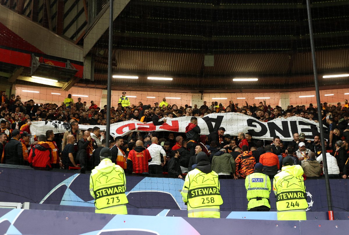 Galatasaray taraftarları, Old Trafford'daki Doğu Tribünü'nün ikinci katındaki 'Dünyada kırmızı olmak gibisi yok' pankartının bir kısmını ev sahibi tribününe girdikten sonra yırttı. Fotoğraf: Reuters.