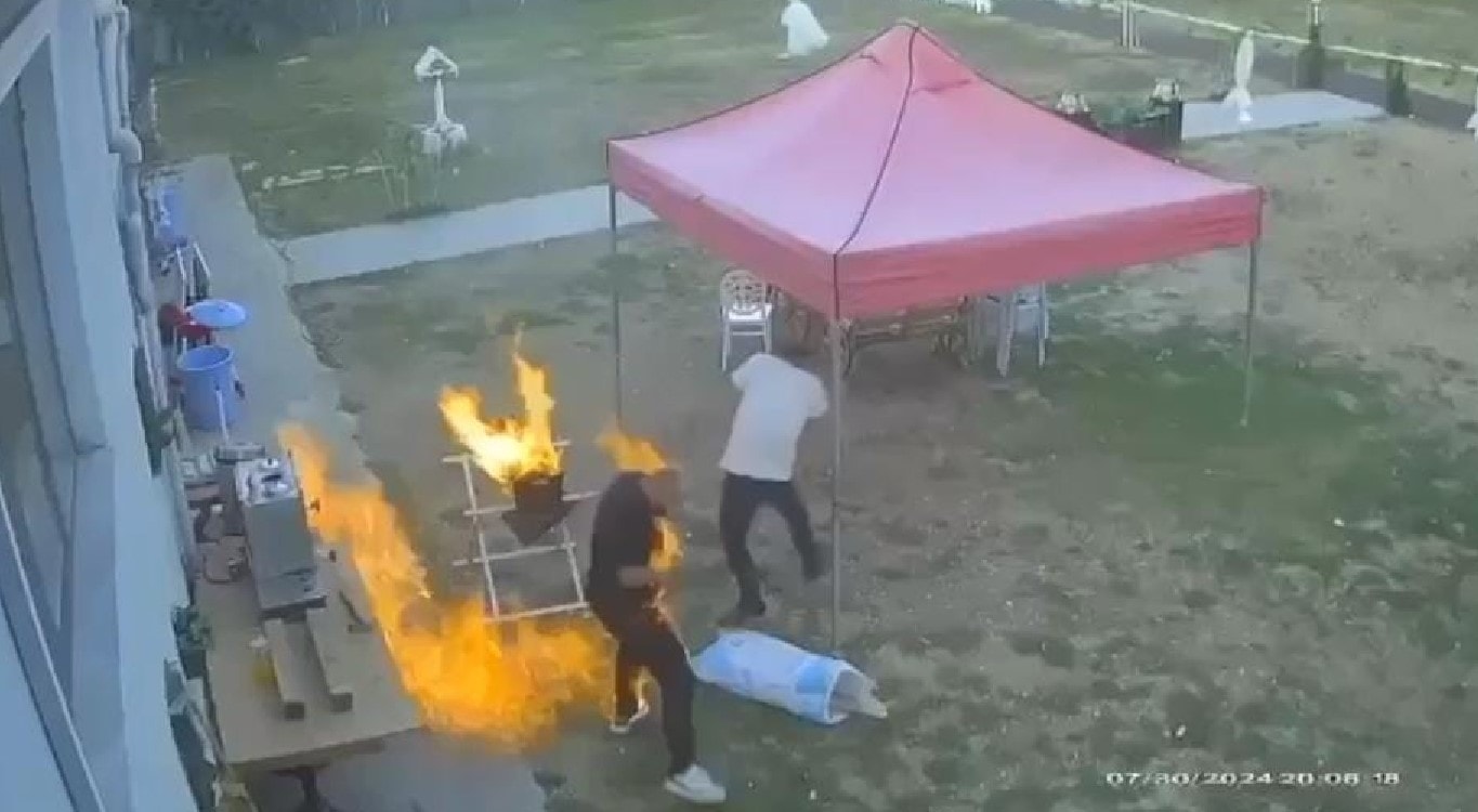 Çevredekiler, çıkarılan kıyafetleri yangın söndürme tüpüyle söndürdü. O anlar, güvenlik kamerasına yansıdı. Vücudunda küçük çaplı yanıklar oluşan Yapıcı, olayın ardından hastaneye giderken kalp krizi geçirdi.