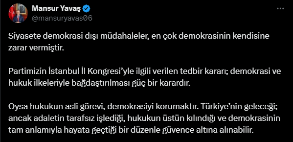 - Partimizin İstanbul İl Kongresi’yle ilgili verilen tedbir kararı; demokrasi ve hukuk ilkeleriyle bağdaştırılması güç bir karardır.