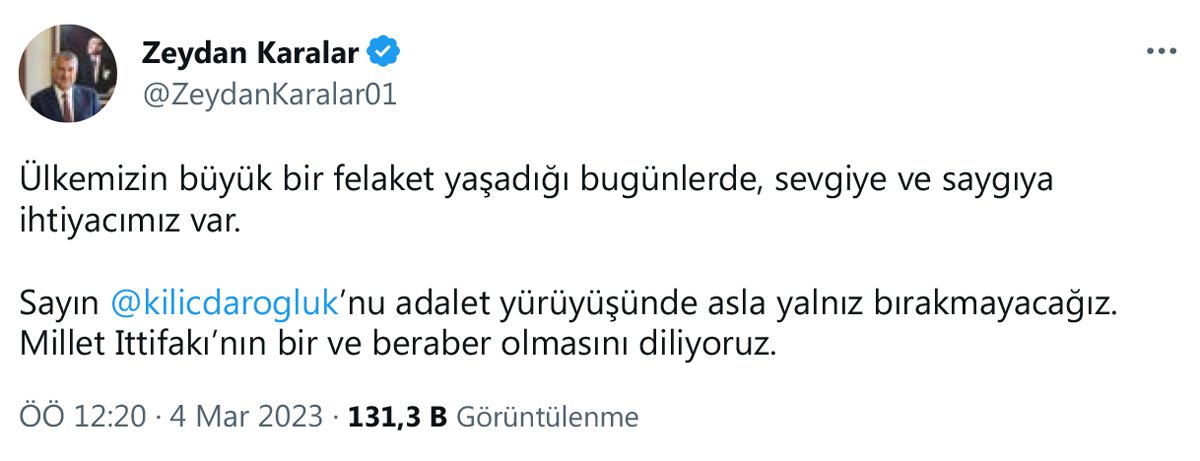 Adana Büyükşehir Belediye Başkanı Zeydan Karalar, Twitter'daki paylaşımında "Ülkemizin büyük bir felaket yaşadığı bugünlerde, sevgiye ve saygıya ihtiyacımız var. Sayın Kemal Kılıçdaroğlu'nu adalet yürüyüşünde asla yalnız bırakmayacağız. Millet İttifakı’nın bir ve beraber olmasını diliyoruz" dedi.