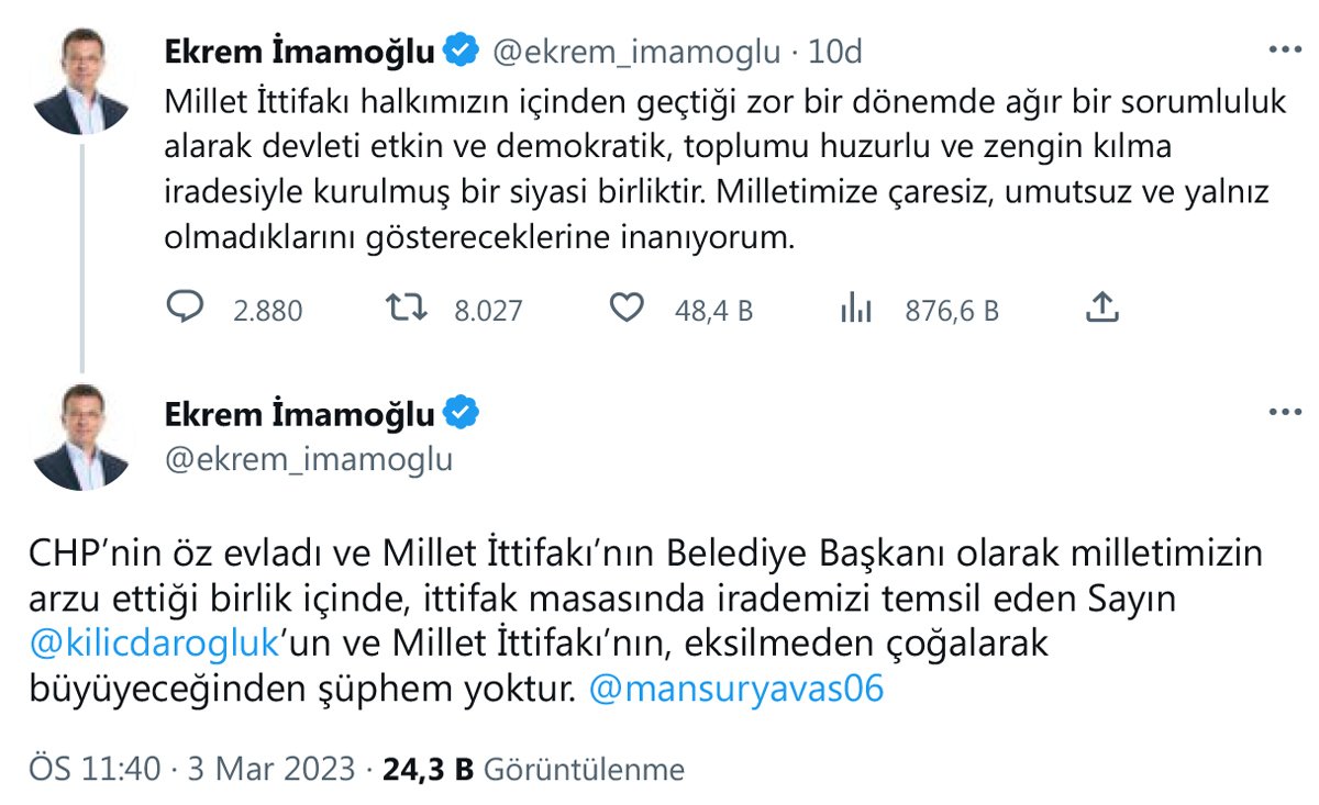 Ekrem İmamoğlu da "Millet İttifakı halkımızın içinden geçtiği zor bir dönemde ağır bir sorumluluk alarak devleti etkin ve demokratik, toplumu huzurlu ve zengin kılma iradesiyle kurulmuş bir siyasi birliktir. Milletimize çaresiz, umutsuz ve yalnız olmadıklarını göstereceklerine inanıyorum. CHP’nin öz evladı ve Millet İttifakı’nın Belediye Başkanı olarak milletimizin arzu ettiği birlik içinde, ittifak masasında irademizi temsil eden Sayın Kemal Kılıçdaroğlu'nun ve Millet İttifakı’nın, eksilmeden çoğalarak büyüyeceğinden şüphem yoktur" dedi. İmamoğlu paylaşımında Kılıçdaroğlu ve Yavaş'ın sosyal medya hesaplarını etiketledi.