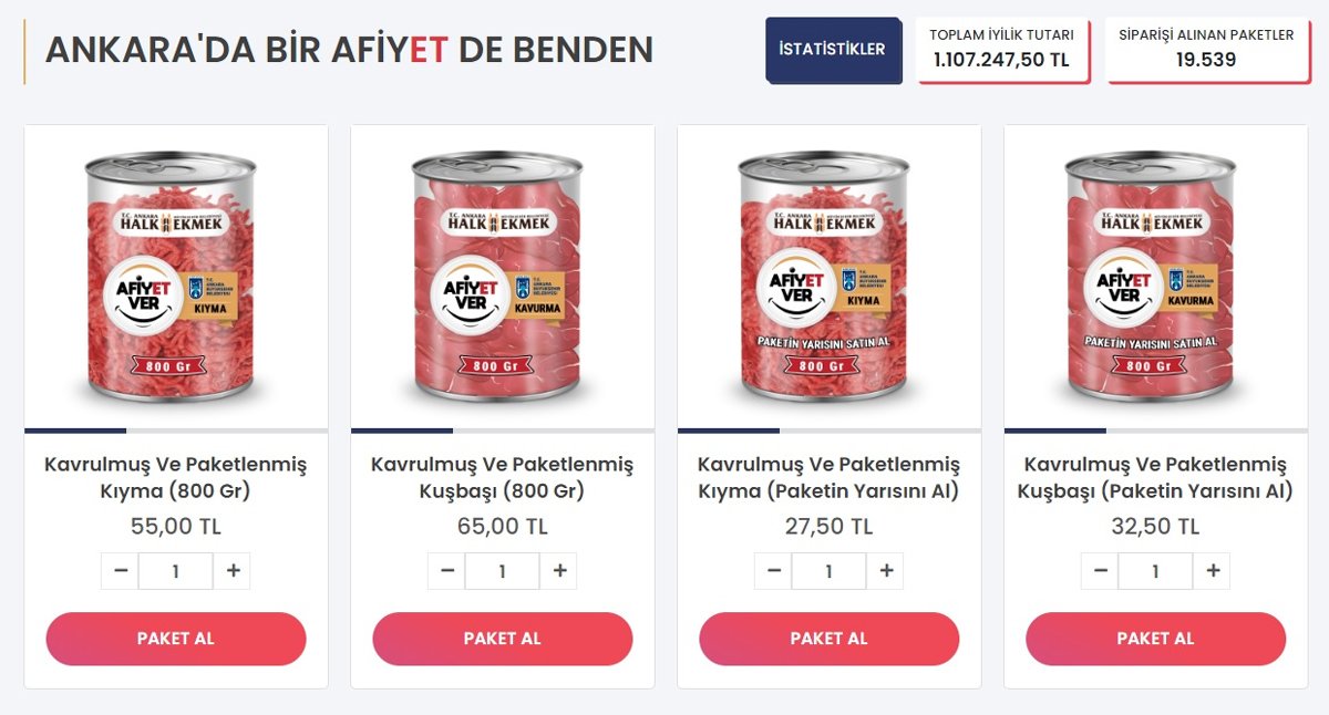 4 ayrı fiyat seçeneğinin sunulduğu “afiyetver.com” adresi üzerinden; Kavrulmuş kuşbaşı paketleri: 400 gram için (paketin yarısı) 32 lira 50 kuruş, 800 gram için 65 TL; Kıyma paketleri: 400 gram için (paketin yarısı) 27 lira 50 kuruş, 800 gram için 55 TL ödenerek kredi kartıyla satın alınabiliyor.