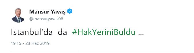 31 Mart seçimlerinde Millet İttifakı adayı olarak Ankara'yı AKP'nin elinden alan Ankara Büyükşehir Belediye Başkanı Mansur Yavaş, yenilenen İstanbul seçimleri sonuçlarının kesinleşmesinin ardından twitter hesabından bir mesaj paylaştı. Yavaş kısa mesajında "İstanbul’da da #HakYeriniBuldu ..." dedi