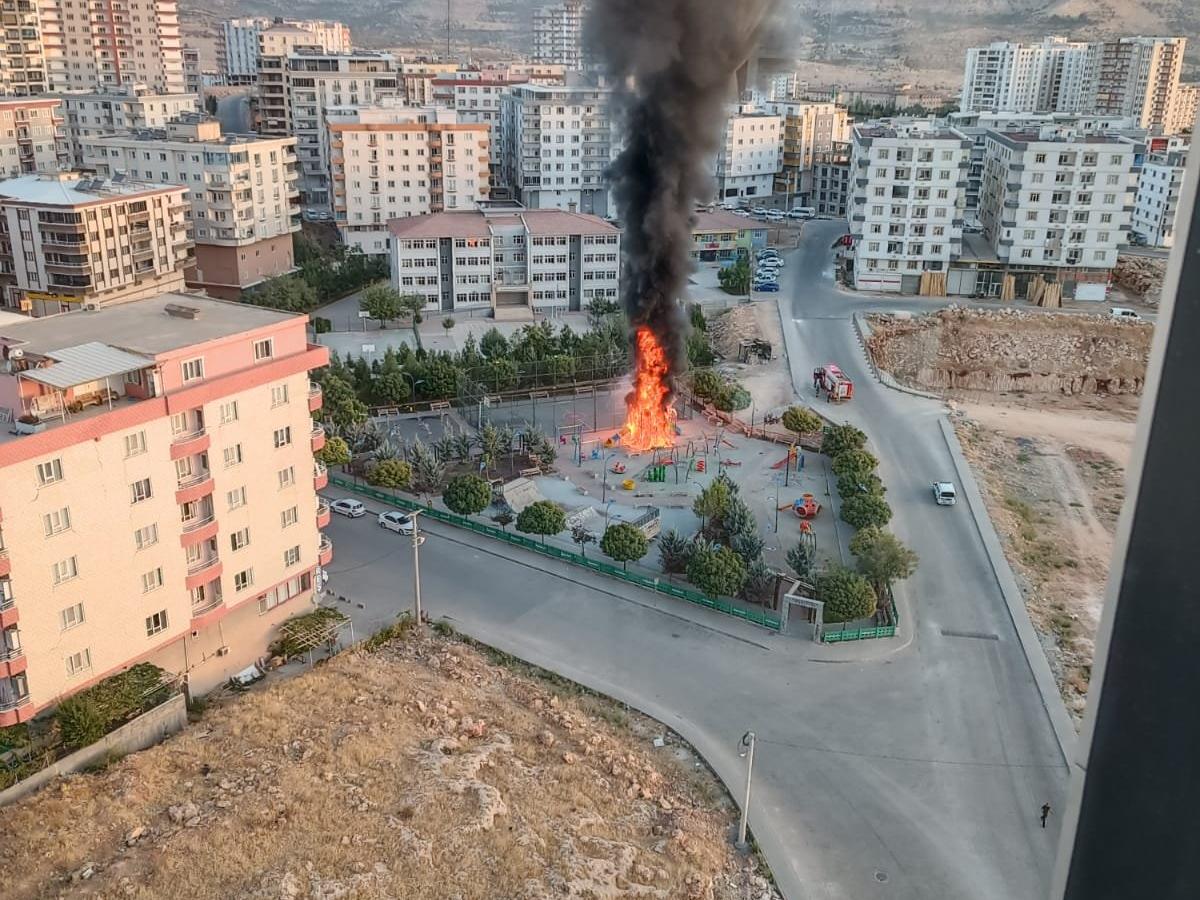 Artuklu ilçesi 13 Mart Mahallesi'nde bir süre önce hizmete açılan Diriliş Parkı'ndaki bazı oyuncaklar, sabah saatlerinde ateşe verildi. O anlar, cep telefonu kamerasına yansıdı.