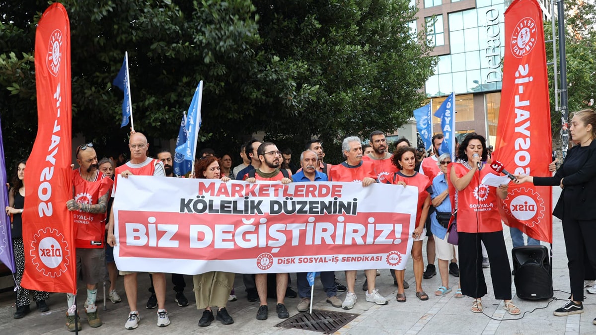 Türkiye Devrimci İşçi Sendikaları Konfederasyonu (DİSK) Sosyal-İş Sendikası Türkiye’nin çeşitli noktalarında eylemlerini sürdürüyor. Mağaza ve market işçileri sıklıkla düşük ücret, uzun çalışma saatleri, mobbing ve güvencesizlik sorunlarını dile getiriyor.