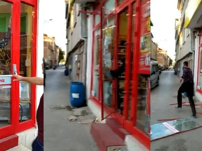 Bursa'da marketten hırsızlık yapacağı sırada kadın kasiyer tarafından içeri kilitlenen hırsızlık zanlısı camı kırarak kaçtı. O anlar kameraya yansıdı.