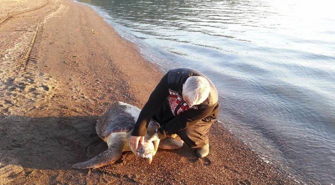FOTO: DHAHisarönü Körfezi kıyısında caretta caretta deniz kaplumbağasını bulan İşadamı Erhan Taşel, "Sahilde dolaşırken kaplumbağa gördüm. İlk başta canlı zannettim ama sonra öldüğünü fark ettim. Caretta caretta deniz kaplumbağasının kabuğu sert cisimle vurularak kırılmış. Öğrendiğim kadarıyla balıkçı ağlarına takılmış ve boğularak ölmüş. Başta balıkçılar olmak üzere herkesi, caretta deniz kaplumbağaları konusunda biraz daha dikkatli olmaya davet ediyorum" dedi.