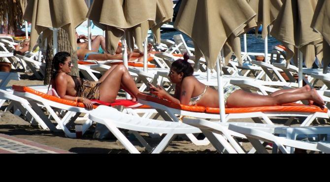 Caddelere konumlandırılmış elektronik termometrelerin 27, yüksek nemle hissedilen 30 dereceye ulaşan sıcaklık nedeniyle birçok turist ve vatandaşlar plajlara akın etti. Deniz suyu sıcaklığının 16 olarak ölçüldüğü ilçede, oteller bölgesi olarak adlandırılan Uzunyalı Mevkii'nden Turban Kavşağı'na kadar uzanan plajlar da turistler renkli görüntüler ortaya çıkardı. Sonbahar mevsiminde denizin keyfini çıkaran turistler, gün boyu çocuklarıyla plajda eğlendi. Bazı turistler şemsiye altında kitap okumayı tercih ederken, birbirinden alımlı kadın turistler denize çektikleri şezlonglarda sere serpe uzanarak güneş altında bronzlaşmaya çalıştı, 8 kilometrelik sahil şeridinde şort ve bikinili yürüyüş yaparak güneşli havanın tadını çıkardı. Jet ski, muz ve deniz paraşütü ile su sporlarında heyecan yaşadı. Otel havuzlarında ise plajları aratmayan görüntüler ortaya çıktı. Turistlerin bazıları şezlonglarında güneşlenmeyi tercih ederken kimileri çocuklarıyla havuzda eğlendi.İlk defa kız arkadaşıyla bir hafta tatile gelen hemşire Nataliia Yavor, "Marmaris cennet gibi. İlk defa kız arkadaşımla tavsiye üzerine tatile geldim. Sonbahar mevsiminde yaz yaşanması güzel. Sürekli denize girip güneşleniyorum" dedi.