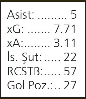 Icardi, santrfor oyuncuları arasında pek çok istatistikte ilk sırada. Asist, toplam gol ve asist beklentisi, isabetli şut, rakip ceza sahasında topla buluşma ile gol pozisyonu yaratma verilerinde tangocudan iyi bir santrfor yok.