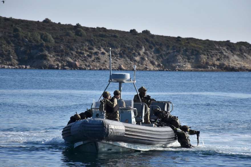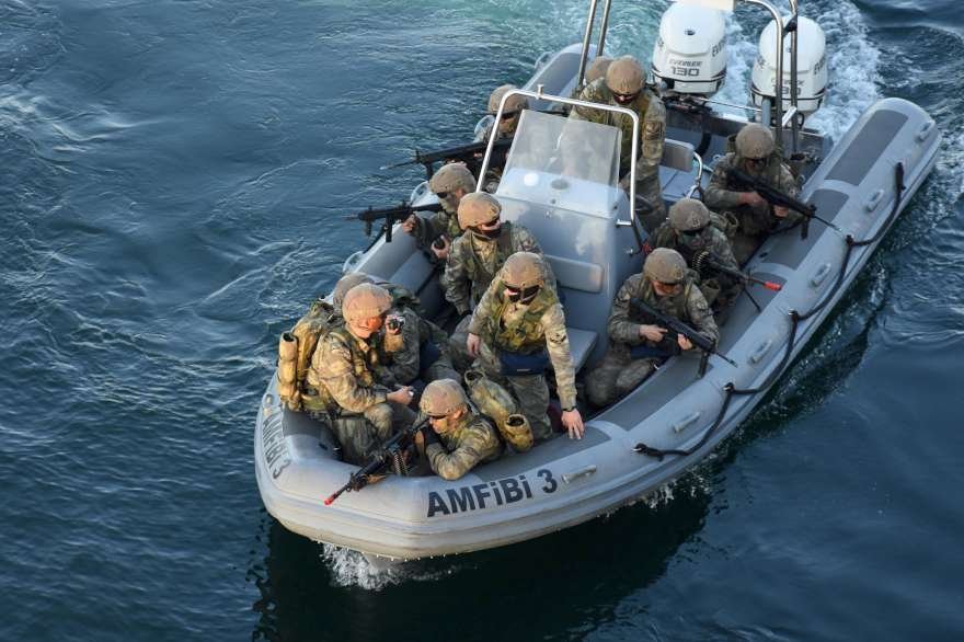Mavi Vatan-2019 tatbikatından kareler Foto: DHAÇıkarma kapsamında TCG Bayraktar gemisindeki amfibi hücum timlerin botları, gemideki 40 ton kaldırma kapasiteli vinçlerle denize indirildi. Çıkarma yapılacak alanın temizlenmesinin ardından ikinci safhada, ATAK helikopterlerinin düşman adasına hava saldırısı ve amfibi piyade deniz birliğinin adaya çıkması icra edilecek.
