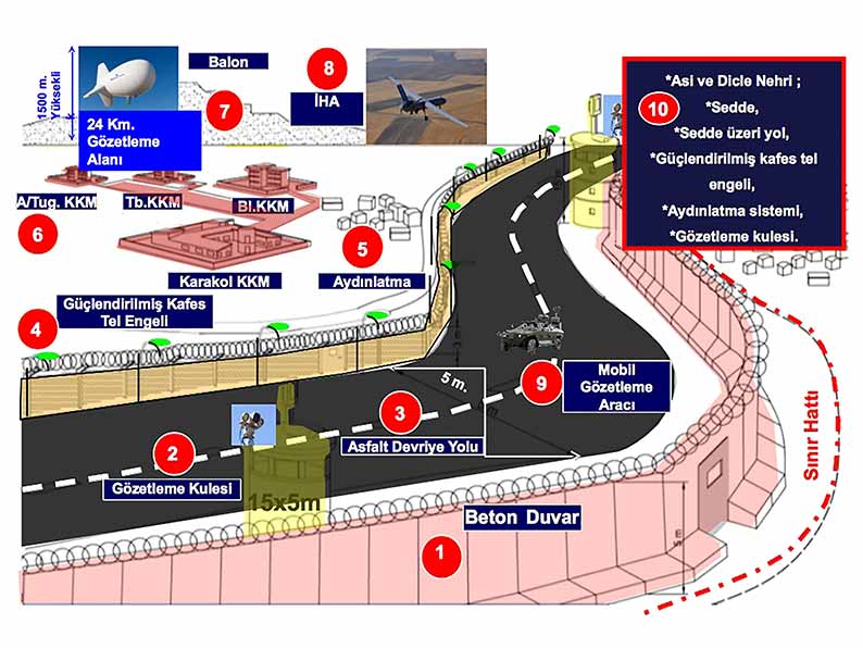 Gözetleme sistemlerinin kurulmasında Aselsan’la da işbirliği yapılacak. Sınır hattında alınacak önlemlerle ilgili fiziki güvenlik sistemlerinin nasıl olacağına ilişkin taslak model konusunda da bakanlar kuruluna brifing verildi ve bu konuda onay alındı.