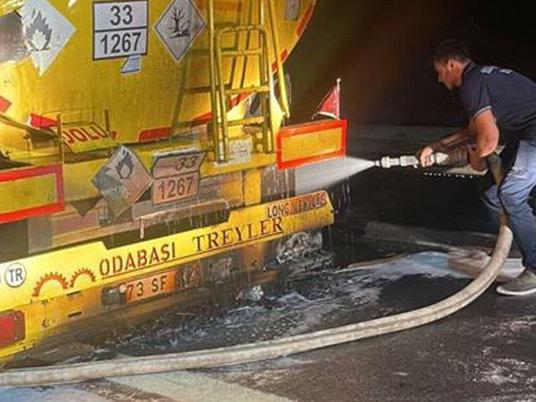 Araçtan dumanlar yükseldiğini fark eden sürücü, tankeri emniyet şeridine çekerek durumu itfaiyeye bildirdi.
