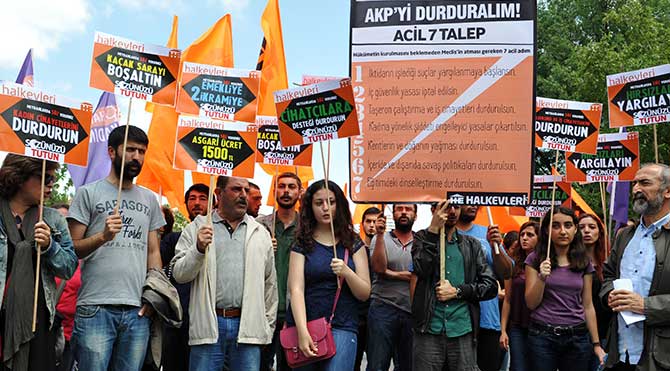 Halkevleri üyesi bir grup, Meclis'in Dikmen kapısının önünde siyasilere yönelik çağrılarda bulundu. Grup, "Meydanlarda söz verdiniz, sözünüzü tutun, AKP'yi durduralım" dedi.
