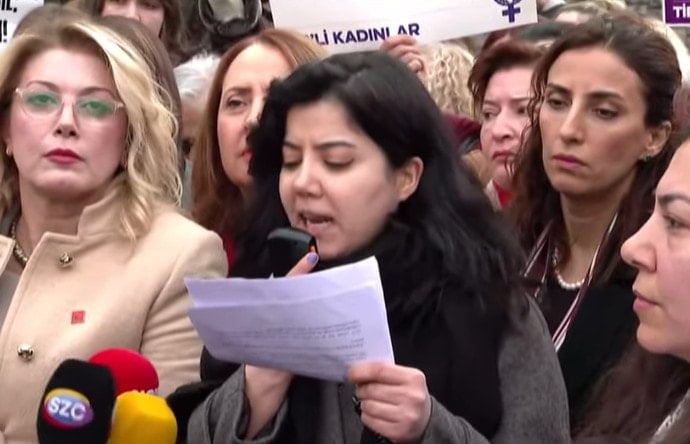 Bugün Ankara Kadın Platformu olarak buradayız. Staj yapan lise öğrencisi kız çocuklarının yıllardır TBMM'de çalışan bir grup erkek tarafından sistematik istismara maruz kaldığı ortaya çıkmıştır."