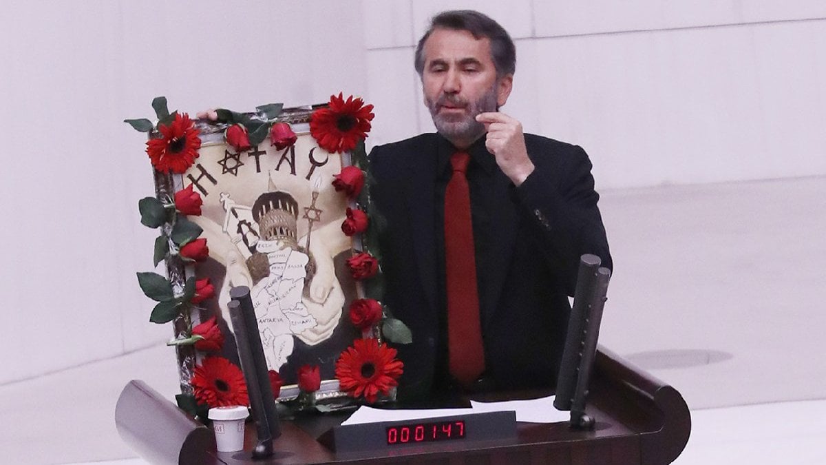 CHP Hatay Milletvekili Serkan Topal Meclis de yaptığı konuşmada kürsüye 4 dini temsil eden simgelerden 'Hatay' yazan çiçekle kenarı süslü çerçeve ile konuştu.