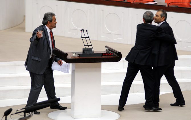YUMRUK İNDİ: Genç CHP sıralarına doğru yürümeye çalışırken AKP’liler kürsünün önünde toplandı. CHP’li vekiller Genç’i korumaya aldı. Genel Kurulun ortasında 50-60 AKP-CHP vekil toplandı. Bu sırada ayrı ayrı itişmeler yaşandı. CHP İstanbul Milletvekili Mahmut Tanal, itişme sırasında AKP Grup Başkanvekili Ahmet Aydın’a yumrukla vurdu. Aydın masanın üzerine düştü.