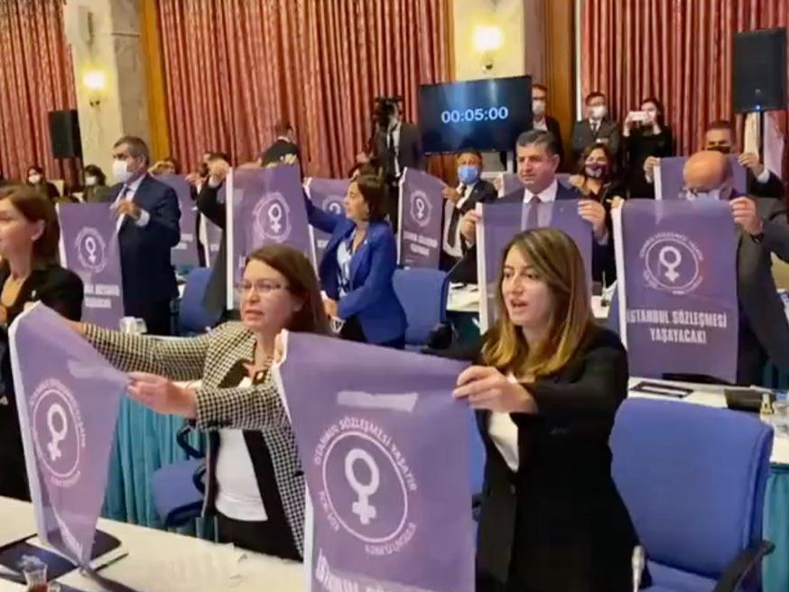 TBMM Plan Bütçe Komisyonunda Aile ve Sosyal Hizmetler Bakanlığı bütçesi ele alınırken CHP milletvekilleri ‘’İstanbul sözleşmesi eylemi’’ yaptılar. Tüm CHP Milletvekilleri ayağa kalkarak ellerinde tuttukları mor renkli ‘’İstanbul sözleşmesi yaşayacak’’ yazılı flamalar açtı.