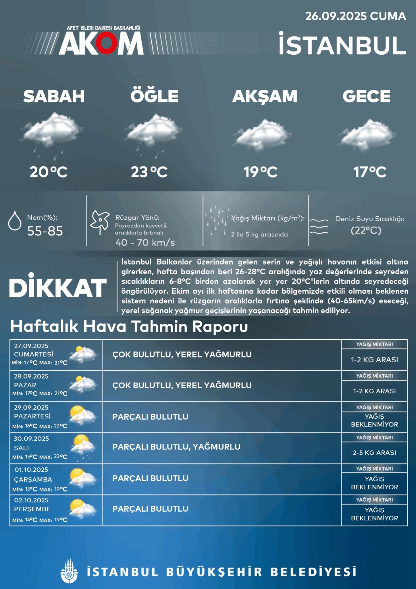 AKOM'dan yapılan açıklamaya göre, serin havanın Ekim ayının ilk haftasına kadar bölgede etkili olması bekleniyor. Bu süre zarfında rüzgarın kuzeyli yönlerden aralıklarla fırtına şeklinde (40-65 km/saat) eseceği, yerel sağanak yağış geçişlerinin yaşanacağı bildirildi.