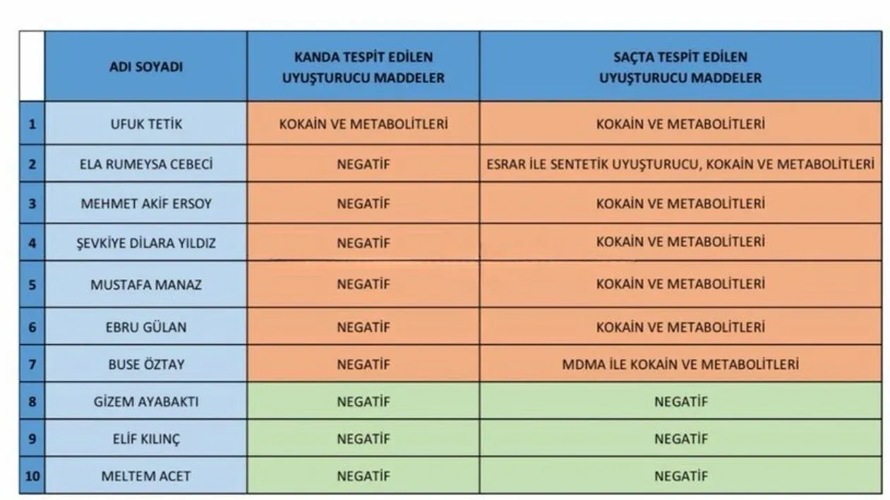 Adli Tıp raporuna göre; Mehmet Akif Ersoy'un testinde "kokain", spiker Ela Rümeysa Cebeci'nin testinde ise "kokain" ve "esrar" çıktığı öğrenildi.